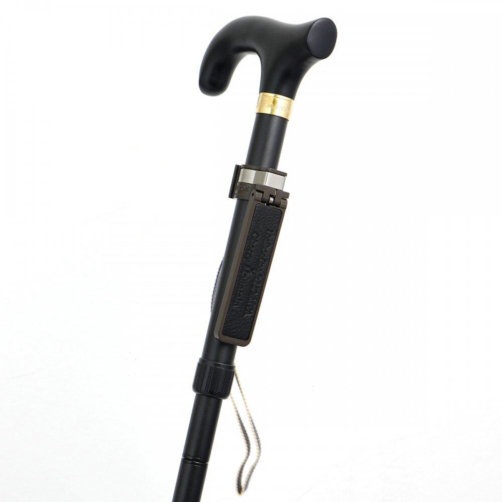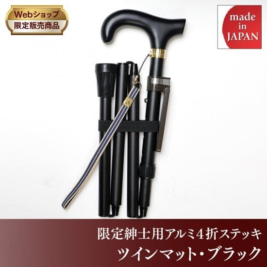 限定紳士用アルミ4折ステッキ『ツインマット』・ブラック 真田紐ストラップ・レザーステッキホルダー・専用収納袋付き