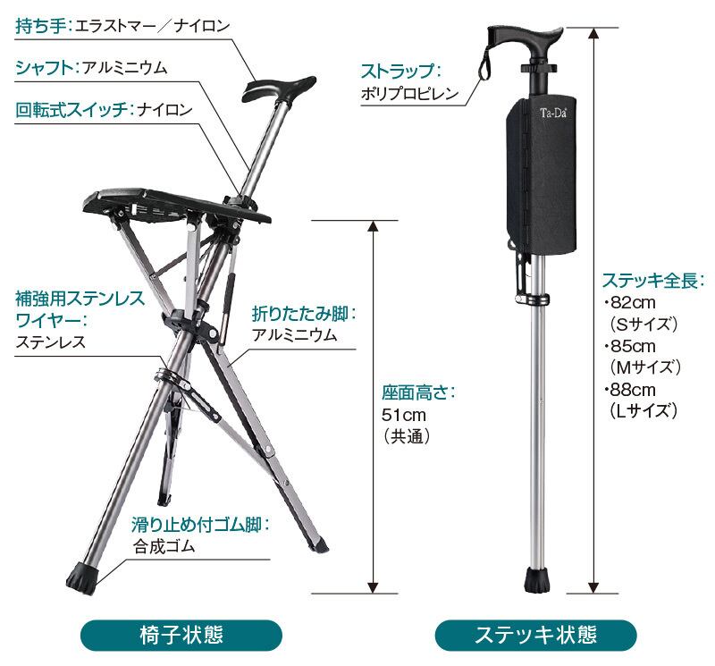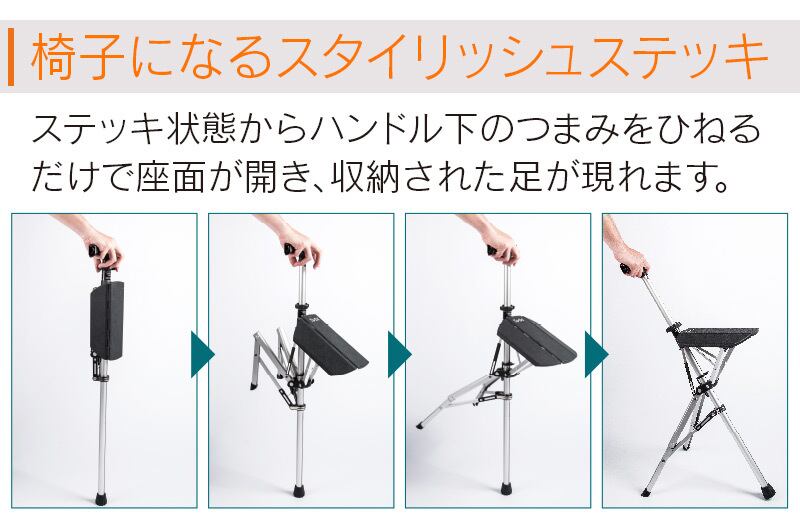 タダチェアーはワンタッチで杖から椅子に早変わり!
