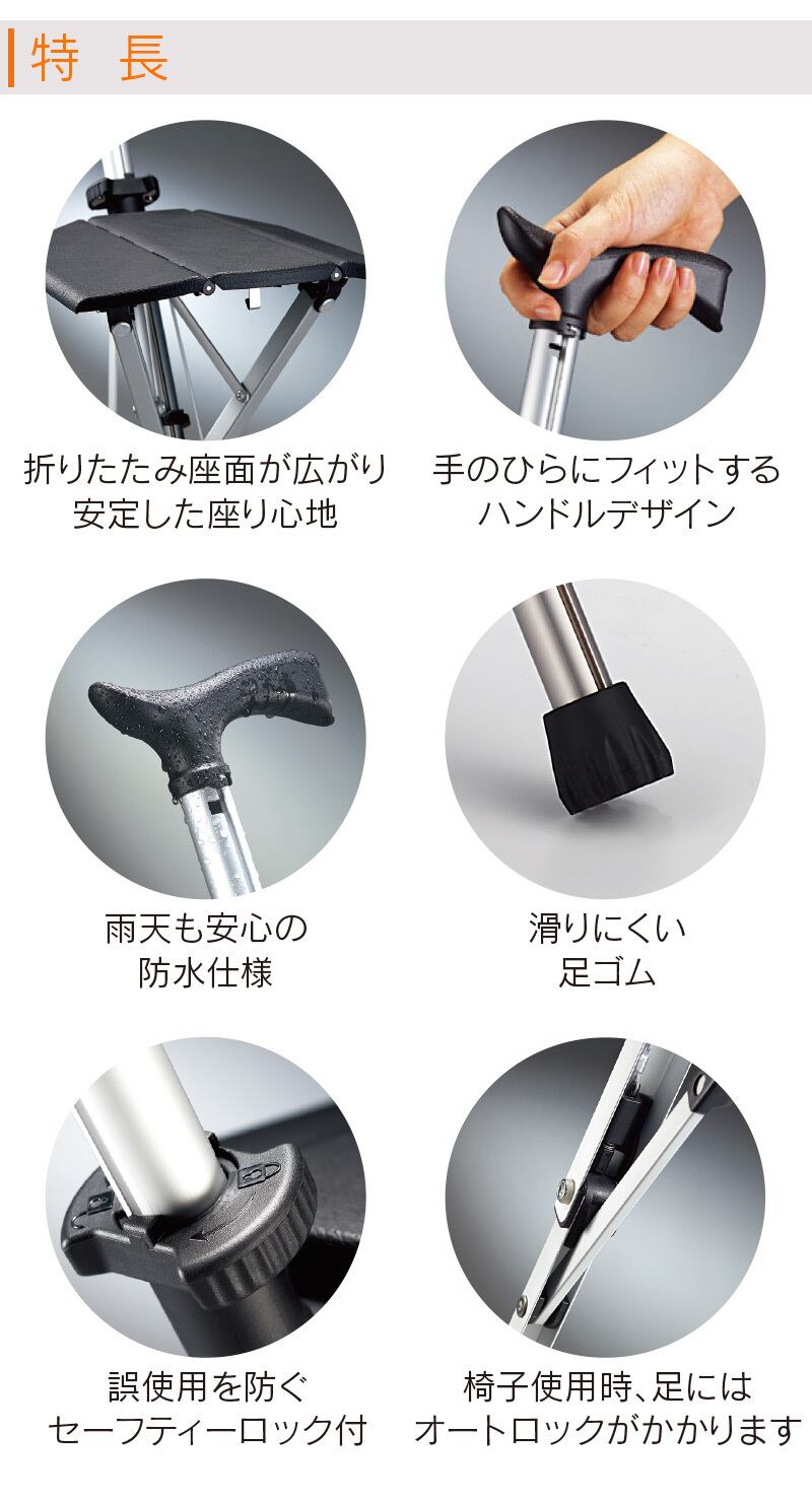 椅子としても使用できる、キャンプやスポーツ観戦など、各種行事やイベント、アウトドアにも便利な多目的ステッキです。